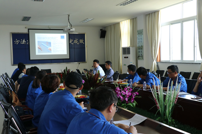 5月22日,染料股份特邀bluesign的^邵泽友一行前来华尔化工厂区解读bluesign认证,股份公司及华尔化工各级领导都高度重视,华尔化工技术副总王登兵、华尔化工后处理负责人刘文波、管理部部长姜燕萍、品管部部长王桂玲、采购部王小峰、应用服务部部长徐杰等相关部门人员列席会议,大家共同认真听取了^的讲解。