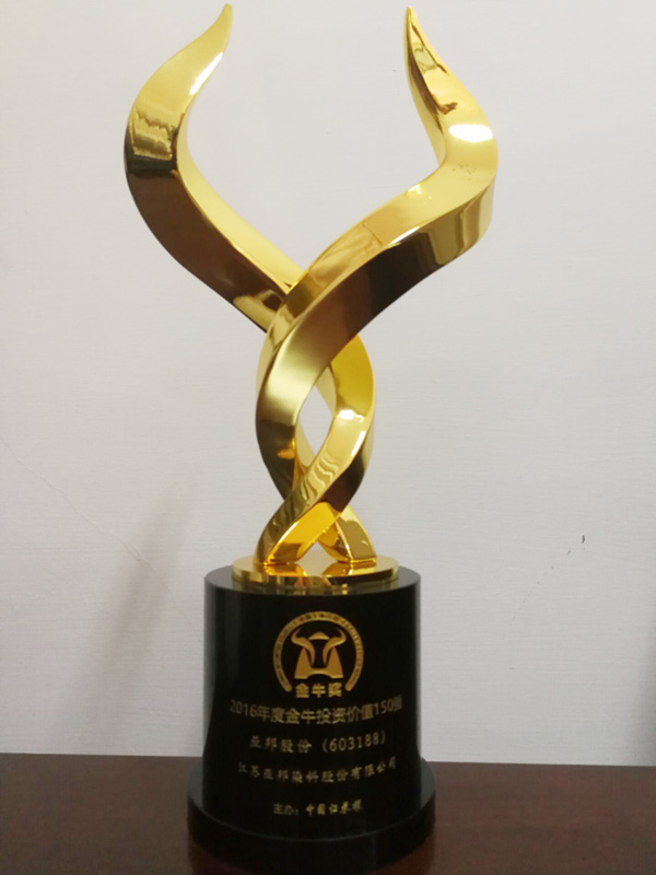 8月15日,由中国证券报主办的“第19届中国上市公司金牛奖颁奖典礼暨高端论坛”在贵州省贵阳市举行,会上由中国证券报主办的第十九届中国上市公司金牛奖评选结果揭晓,江苏亚邦染料股份有限公司(亚邦股份)凭借在上市公司领域的突出表现入围2016年度“金牛投资价值150强”。第19届中国上市公司金牛奖由中国财富传媒集团、中国证券报联合中诚信集团等联合举办。已成功举办了十九届的中国上市公司金牛奖以其在业内的权威性和含金量,堪称上市公司领域的“小金人”。此次评选,以2016年1月之前在沪深交易所上市的3000多家公司作为参评对象。选取包括资产负债率、营业收入三年增长率等13个财务指标作为评估上市公司的指标体系。根据赛弥(Themis)纯定量异常值评级技术对上市公司财务安全做出客观评价,剔除出财务安全显著恶化以及财务安全风险度较高的上市公司,并采用主成分分析方法对上市公司财务指标进行优化排序。本次评选看重上市公司持续的盈利能力和稳定的投资回报,比对同行上市公司市盈率(市盈率按照2016年利润计算),^终共有139家企业入围。